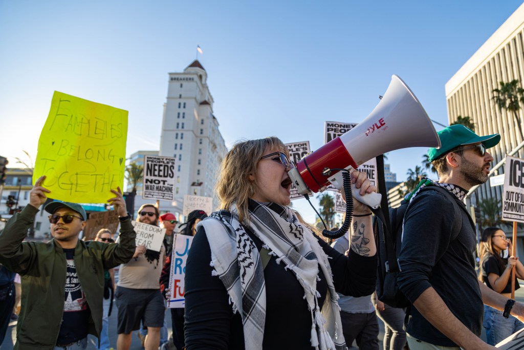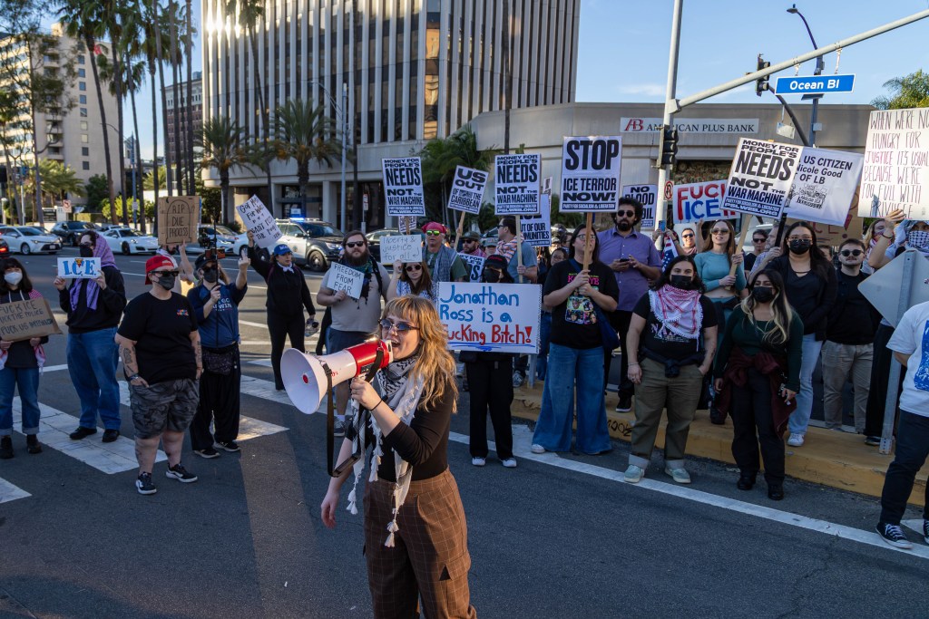 Protestors marched in the streets during the National Day of Action protest on Jan. 10, 2026 as they stopped outside of the Long Beach Preforming Arts Theater to scream chants to the people at the Anime Convention nearby. (Samuel Chacko | Signal Tribune)