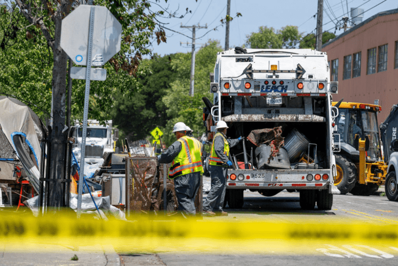 City workers remove tents and other belongings during an operation to clear the camp last June. Credit: Adahlia Cole for Berkeleyside