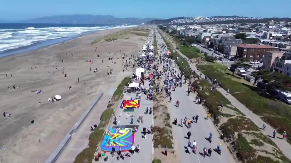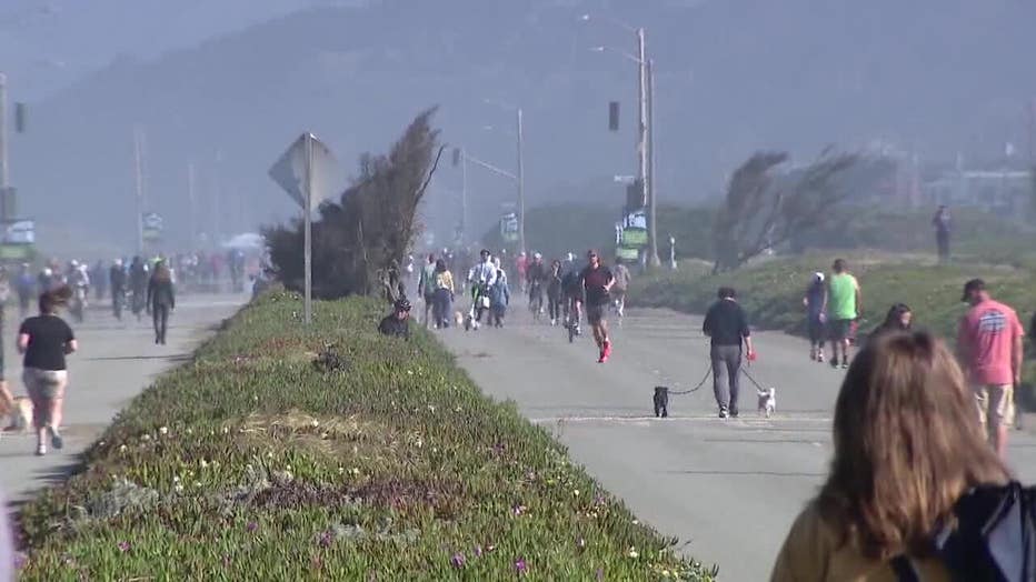 People walk and roller skate on the Great Highway in San Francisco.
