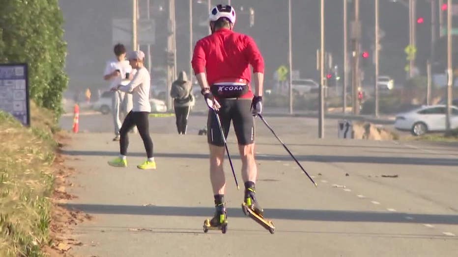 A man rollerblades along the Great Highway in San Francisco.
