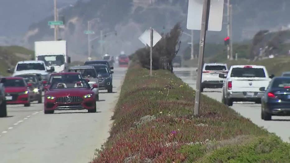 Cars drive along the Great Highway in San Francisco.