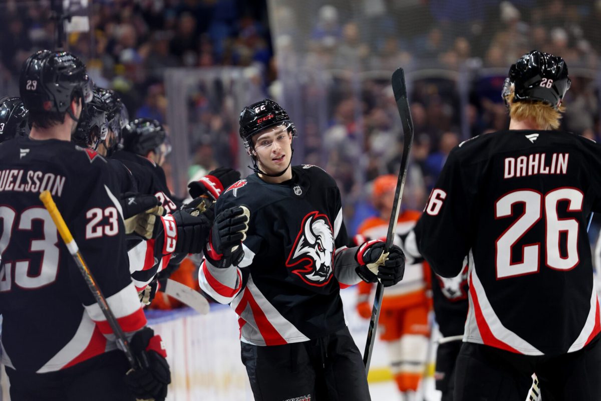 Jan 10, 2026; Buffalo, New York, USA; Buffalo Sabres right wing Jack Quinn (22) celebrates his second goal of the game with teammates during the third period against the Anaheim Ducks at KeyBank Center. Mandatory Credit: Timothy T. Ludwig-Imagn Images