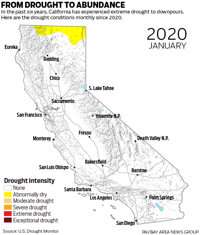 Six years ago, in January 2020, none of the state was classified as being in a drought. Just 3% — a tiny sliver in Modoc and Siskiyou counties near the Oregon border — was rated as “abnormally dry,” according to the U.S. Drought Monitor, a weekly report put out by the NOAA, the National Oceanic and Atmospheric Administration; the U.S. Department of Agriculture; and the University of Nebraska.