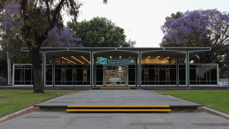 The Hunt Branch Library on May 28, 2024. Given to the City of Fullerton as a gift from Norton Simon in 1962, the midcentury modern library was designed by architect William Pereira. Credit: ERIKA TAYLOR, Voice of OC