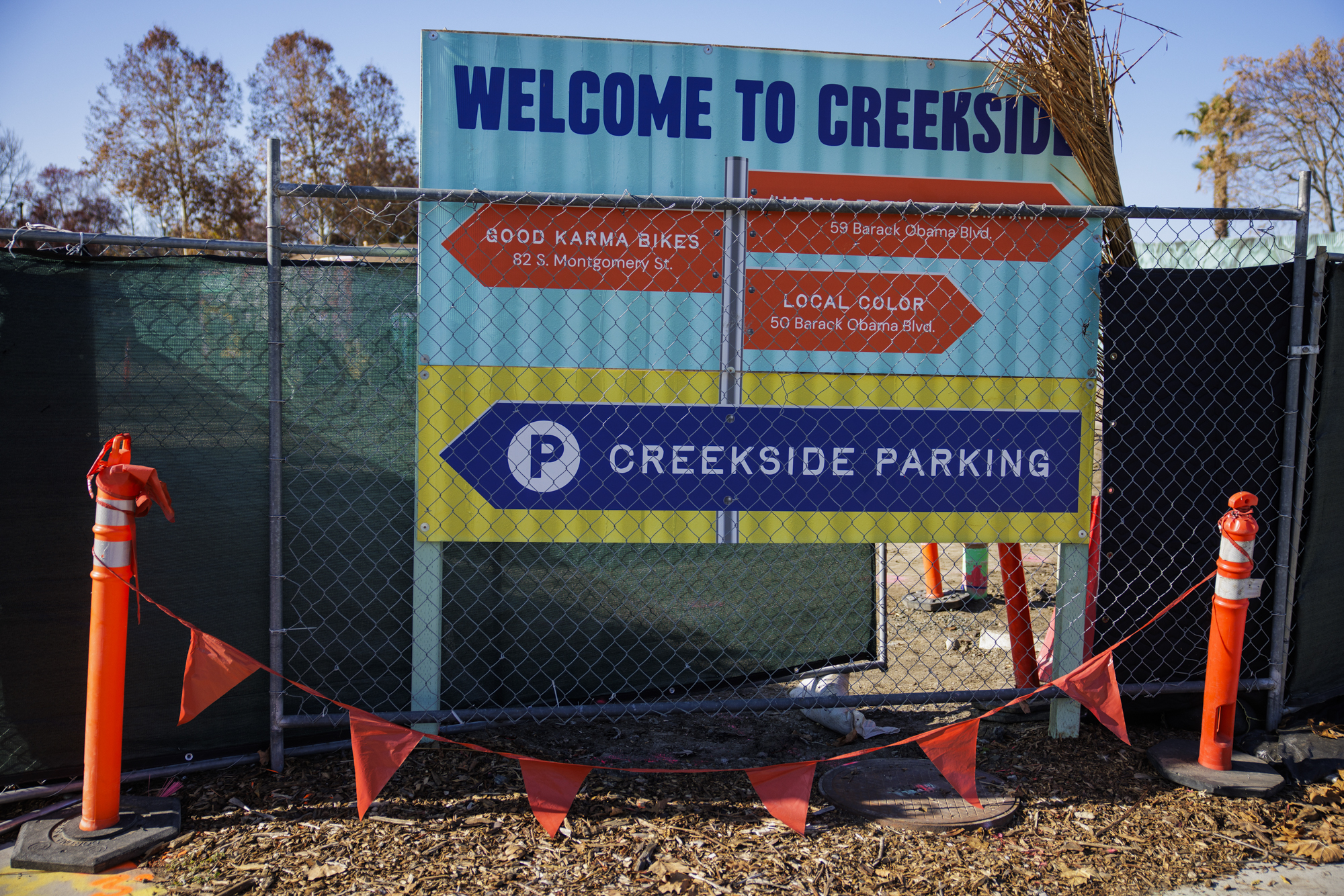 A sign for Creekside San José in front of the lot where the Poor House stood in San José on Dec. 8, 2025. (Martin do Nascimento/KQED)