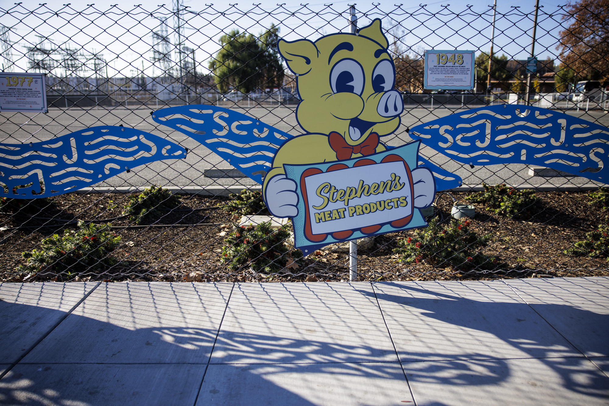 A sign on a fence commemorating the Stephen’s Meat Products sign in San José on Dec. 8, 2025. (Martin do Nascimento/KQED)