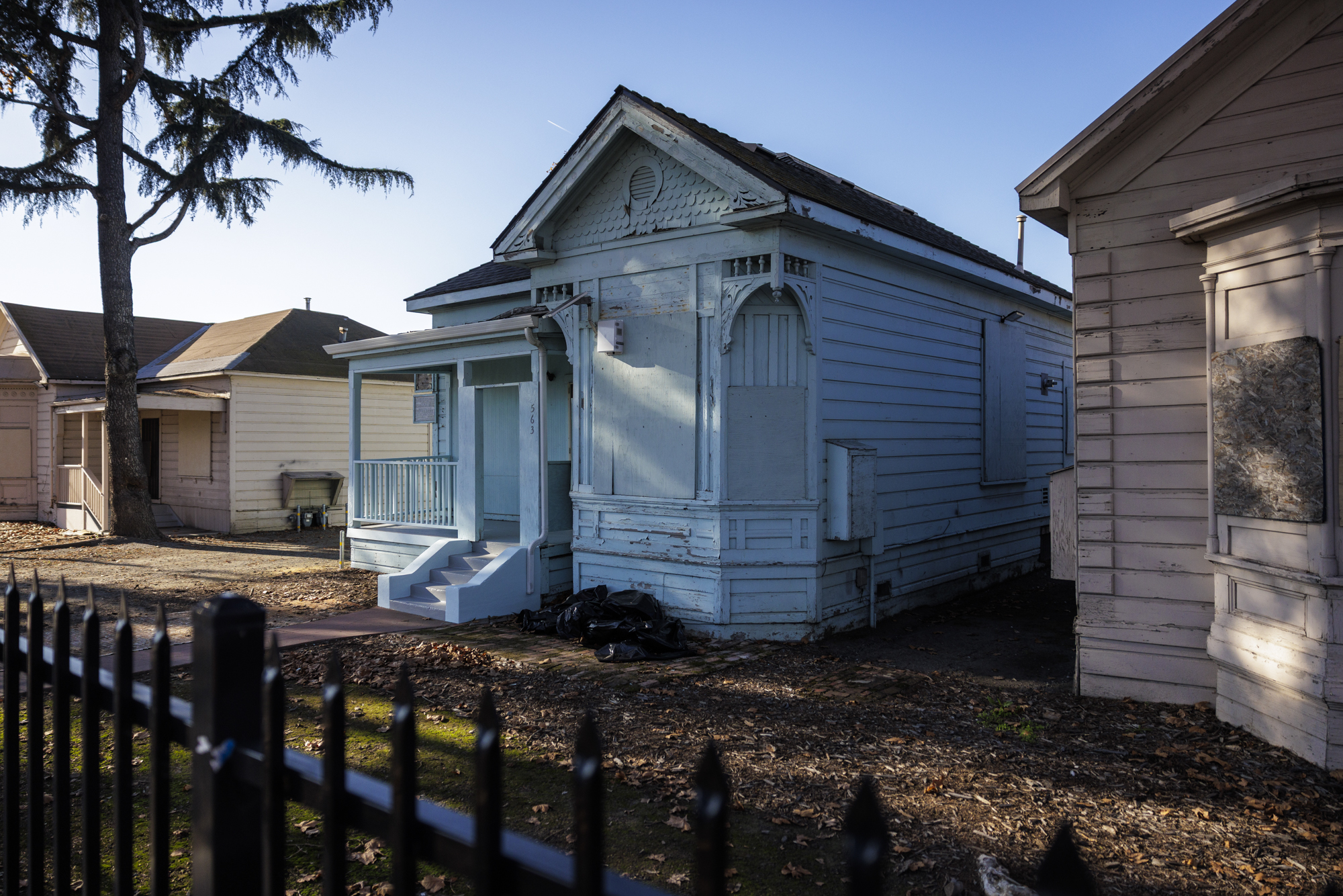 One of three Victorian-era homes on W. Julian Street in San José now owned by Google that could eventually be relocated as part of the company’s development plans for the area on Dec. 8, 2025. (Martin do Nascimento/KQED)