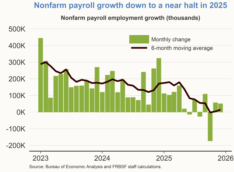 Job growth started 2025 on solid footing. Nonfarm payroll employment from the Bureau of Labor Statistics’ (BLS) Current Employment Statistics (CES) averaged 123,000 new jobs per month over the first four months of 2025, a solid pace of job creation. The picture began to change notably in May 2025. Indeed, the second half of 2025 recorded three months with outright declines in payroll employment, and average job growth fell to just 15,000 per month.