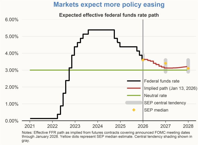 Given the recent evolution of the data, policymakers have indicated that some additional monetary policy easing will likely be needed in 2026. The median projection for the year-end value of the federal funds rate from the December 2025 Summary of Economic Projections (SEP) indicated that one 25 basis point cut in the funds rate would be appropriate in 2026, followed by another 25 basis point cut in 2027. In contrast, financial market participants expect the second 25 basis point cut to be pulled forward into 2026.