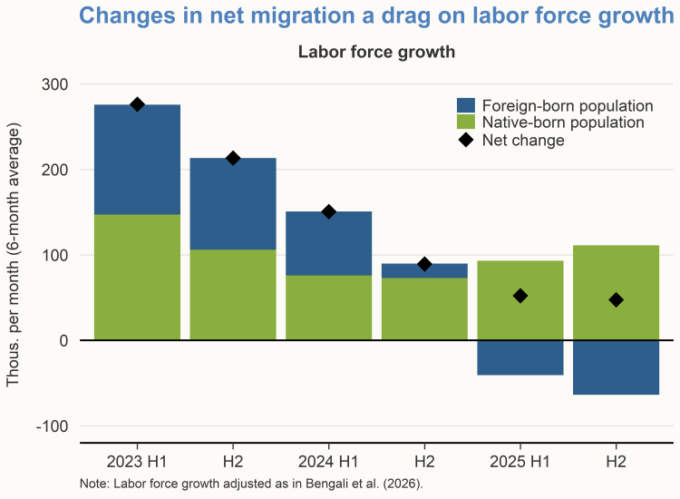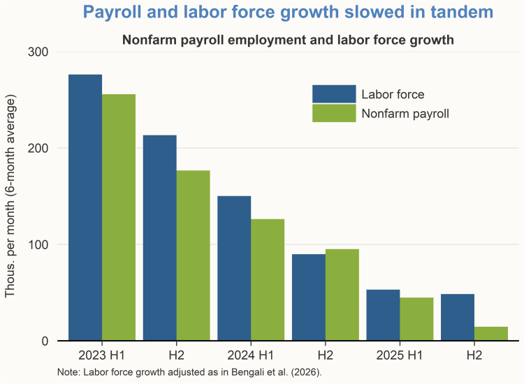 This seeming puzzle of a relatively stable unemployment rate in the face of sharp declines in job growth can be explained by a balanced slowdown in both labor supply and labor demand. Specifically, growth in the size of the labor force (labor supply) has slowed at close to the same pace as new job growth (labor demand). Recent research by Bengali, et al. (2026) identifies this tandem slowdown pattern going back to early 2023. This pattern becomes apparent once adjustments are made to the labor force numbers that align the measurement of jobs in the BLS’s Current Population Survey on some definitional dimensions with the CES and that address issues in measuring rapid changes in net migration and their impact on labor force growth.