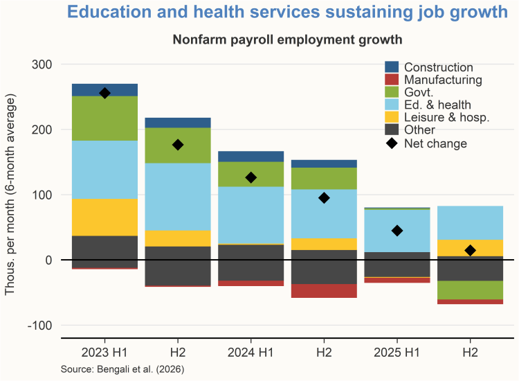 The recent decline in job growth has been broad based across sectors, indicating a widespread slowing of labor demand. However, the vast majority of job growth in 2025 was limited to a single sector—education and health services—with other sectors losing jobs or showing almost no job growth. For example, the government sector, which had been a significant source of job growth in prior years, lost jobs in the second half of 2025.