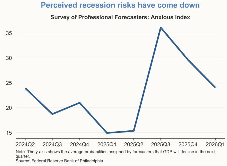 Confidence in the economic growth outlook appears to be spreading. Respondents to the Federal Reserve Bank of Philadelphia’s Survey of Professional Forecasters were notably concerned in June 2025 about rising recession risks. In that month, the survey, also known as the Anxious Index, recorded an average probability of a real GDP decline over the coming quarter of 36%, up from just 15% in March 2025. But as of December 2025, the index had declined to 24%.