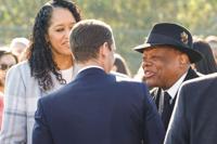 Former Mayor Willie Brown and current District Attorney Brooke Jenkins greet Mayor Daniel Lurie after his State of the City Address at Rossi Park in San Francisco on Thursday, Jan. 15, 2026.