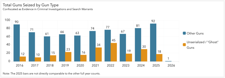 “Over the last decade, handguns have remained the most common recovery, though we saw a notable surge in ghost guns between 2020 and 2022 followed by a decline in the years since,” Carianna Arredondo, an assistant to the city manager, said in an email. Arredondo is the city manager’s office’s point person for Reimagining Public Safety, an initiative that began in 2020, in the wake of the murder of George Floyd, to change how Berkeley conducts traffic and criminal investigations, crisis outreach and behavioral health work.