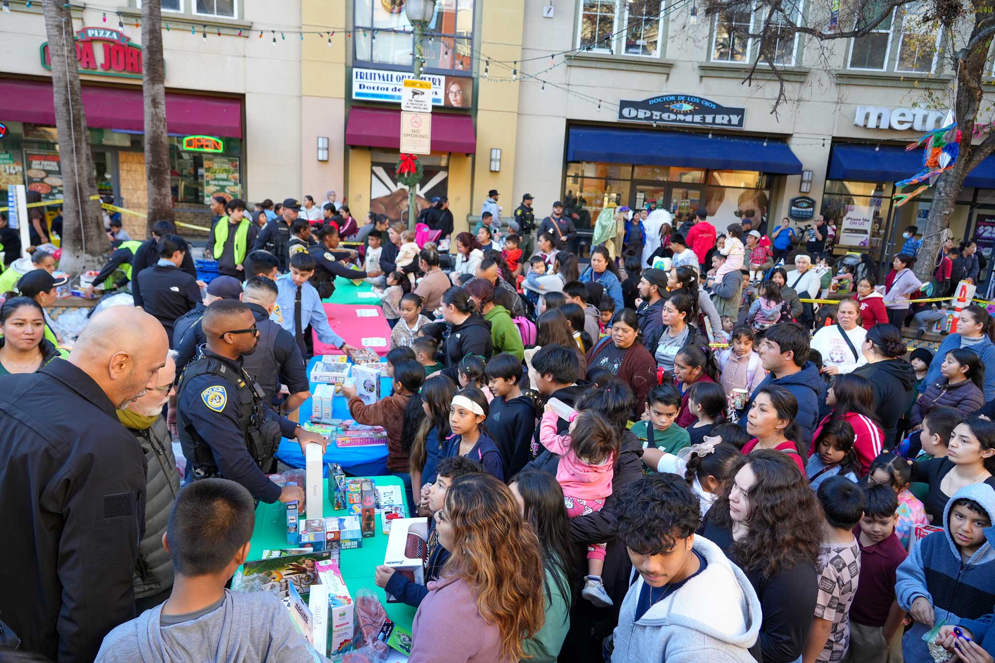 Crowd awaits the toy distribution in the Fruitvale district