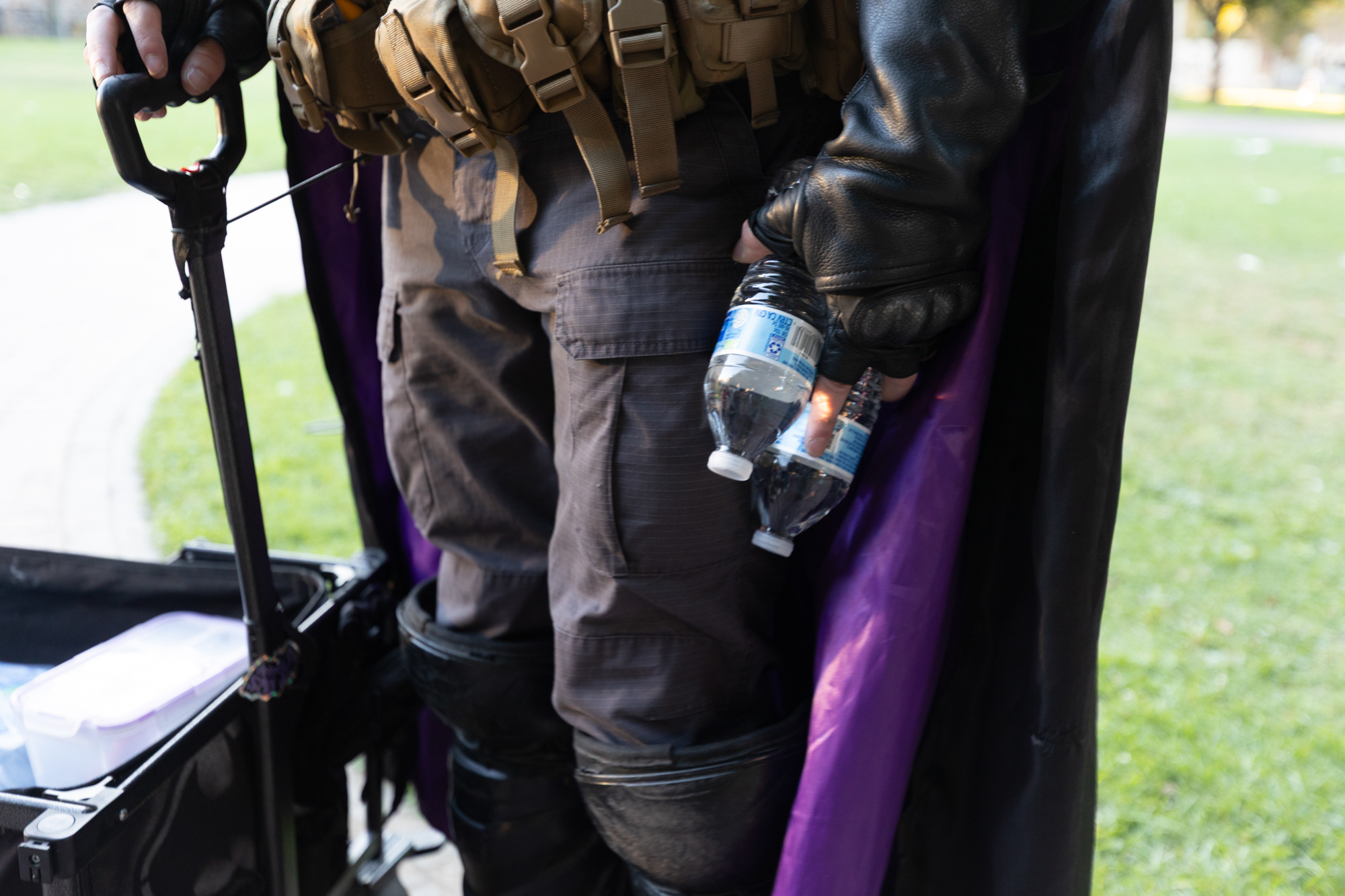 Since then, he has designed the costume with intention: gloves for scrambling up riverbanks, shin guards for kneeling beside tents, a belt filled with first-aid supplies, tools and tape. And the dramatic cape? It doubles as an emergency blanket.