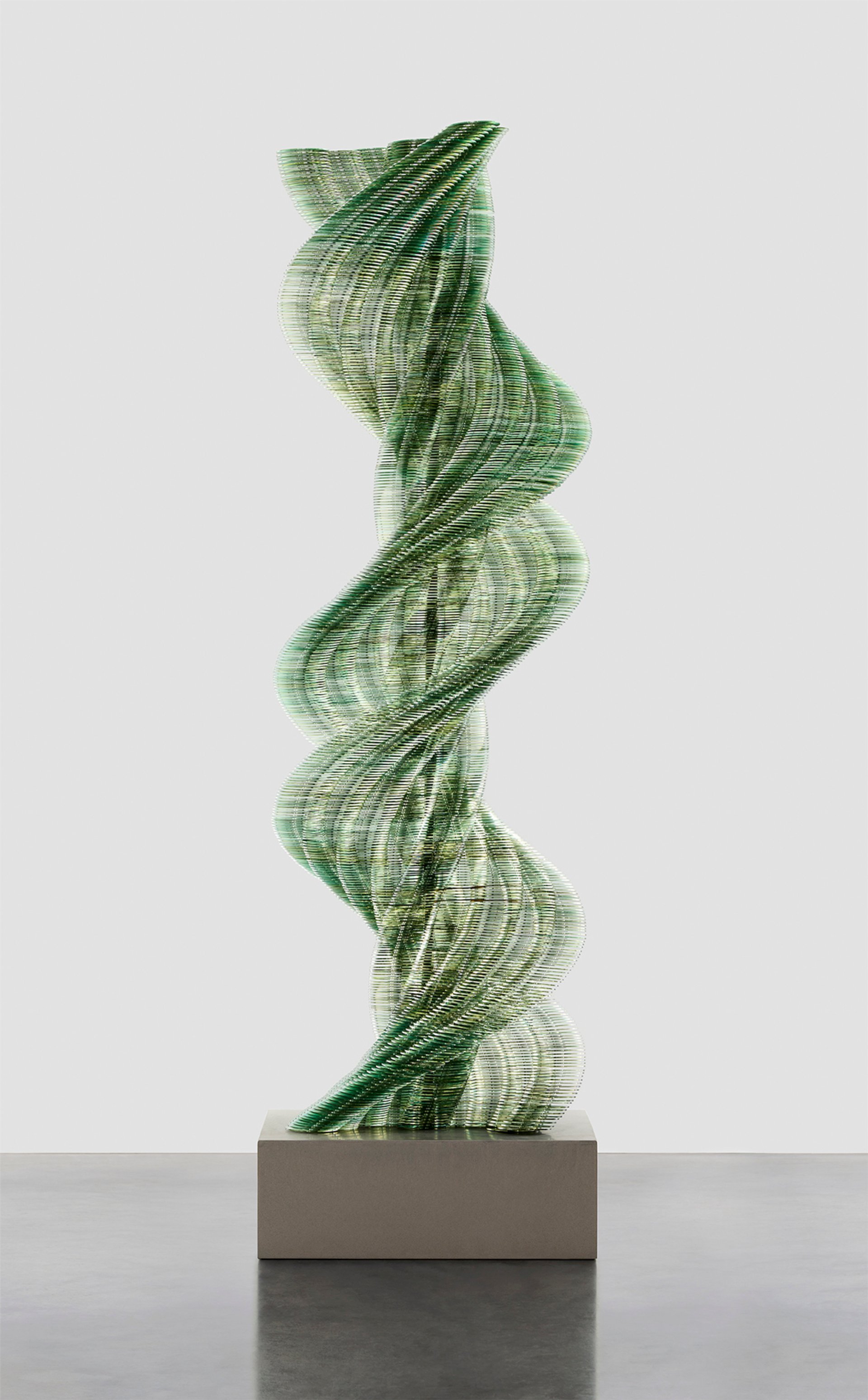 Donovan’s columnar sculptures, especially fitting for display inside a skyscraper, are made using old CDs sourced from eBay—everything from home-burned music mixes to family-photo archives and outdated software. The first versions of her Stratagem columns were exhibited in 2024 at New York’s Pace Gallery, where daylight from a wall of windows caused them to dissolve and reassemble visually as viewers moved around them.