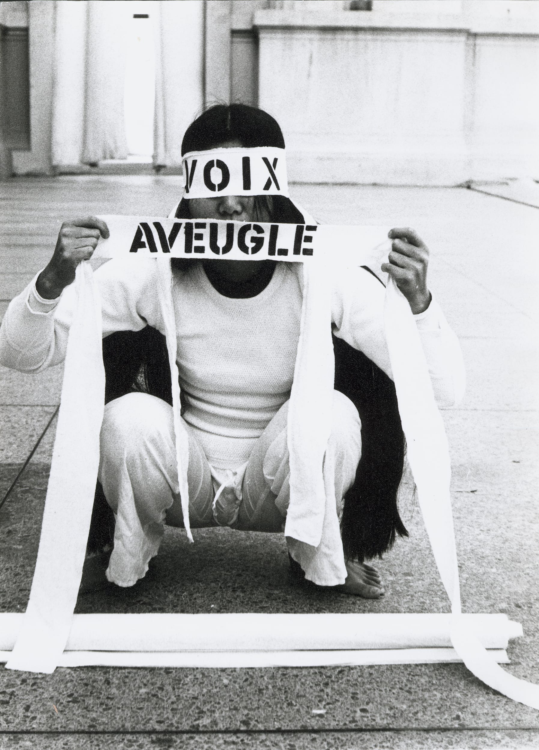 Theresa Hak Kyung Cha, “Aveugle Voix” (1975), documentation of performance rehearsal at Greek Theater, University of California, Berkeley (photograph by Trip Callaghan. Gift of the Theresa Hak Kyung Cha Memorial Foundation)