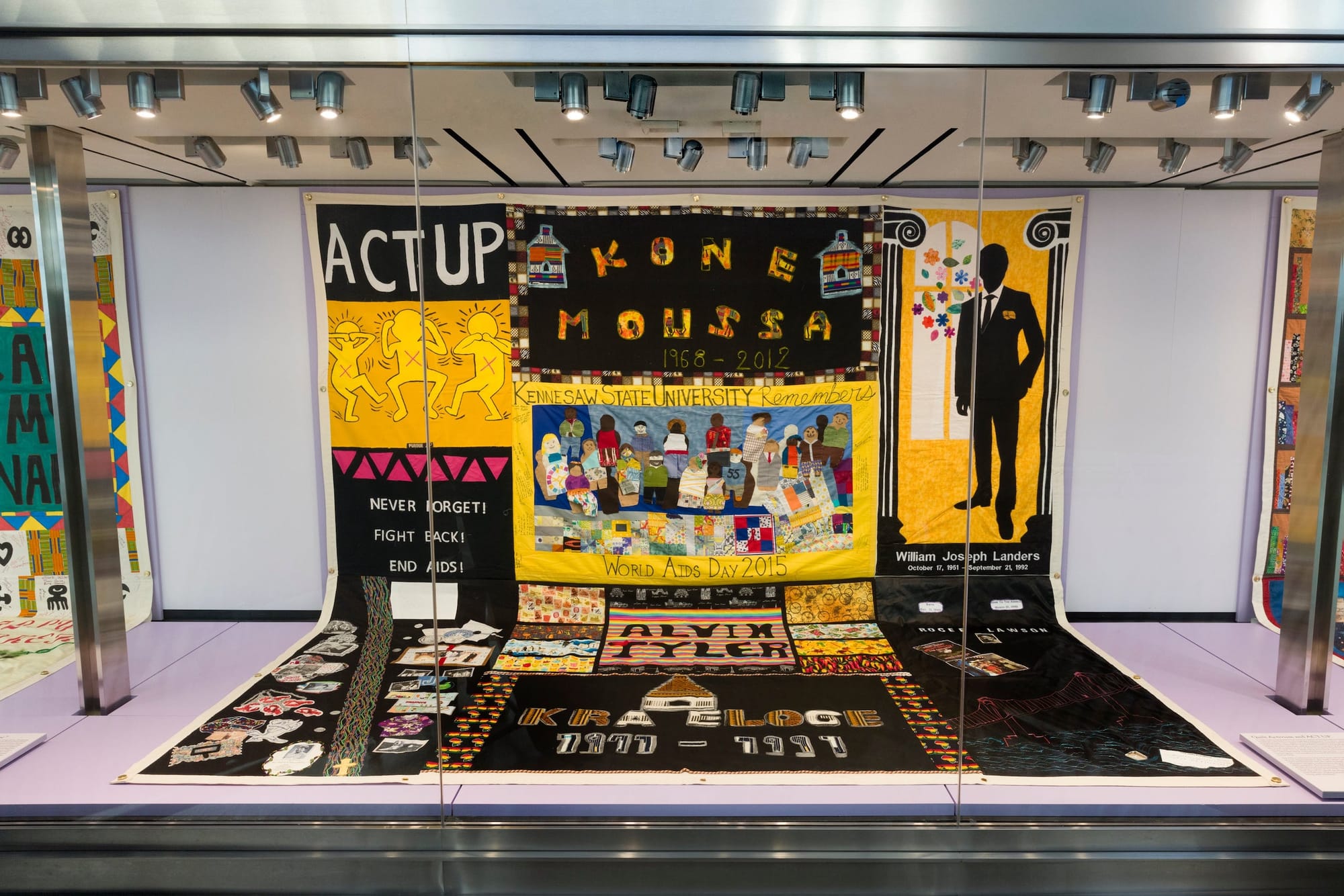Installation view of a work in AIDS Memorial Quilt at the San Francisco Airport Museum (courtesy SFO Museum)