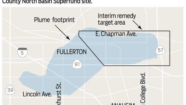 The groundwater plume spans in the basin from roughly near the 57 on the west to Chapman and Commonwealth avenues to the north, Lincoln Avenue to the south, and Magnolia Avenue to the east.