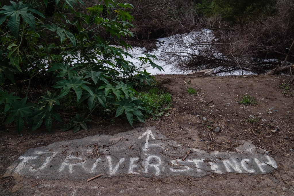 “TJ River Stench” written on the ground next to a “hot spot” where scientists measured high levels of hydrogen sulfide gas in the Tijuana River. It’s located just south of Berry Elementary on Nov. 20, 2025, in San Ysidro. / Ariana Drehsler for Voice of San Diego