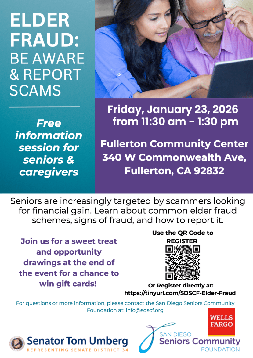 As elder fraud continues to escalate nationwide, the San Diego Seniors Community Foundation (SDSCF) is significantly expanding its Elder Fraud Prevention education efforts across San Diego County, Orange County, and Los Angeles County, supported by a transformational gift of more than $200,000 from the Wells Fargo Foundation.