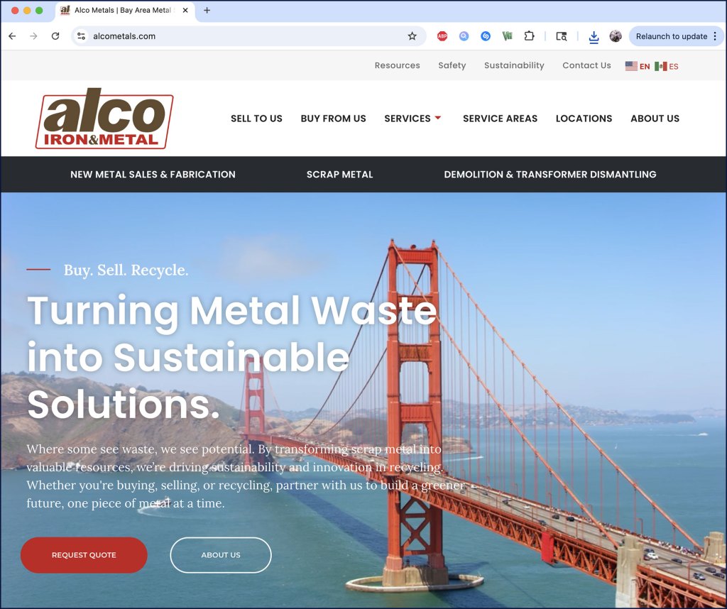 A screenshot of the Alco Iron & Metal Co. website on Friday, Jan. 16, 2026. The company traces its roots to 1909, and it has been incorporated in San Leandro since 1972. (Screenshot via alcometals.com)