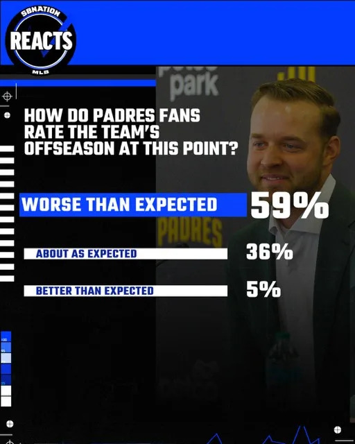 As with anything, there is a process to building the roster, but to this point in the offseason the Friar Faithful have been less than thrilled with the moves the team has made. Most fans who took part in the latest Padres Reacts Survey said the offseason has been worse than they expected. Some of that may be due to the sudden resignation of manager Mike Shildt or the news the Seidler family was exploring a potential sale of the club, but the lack of moves and additions to the roster has to be the biggest factor in the way fans feel about the team.