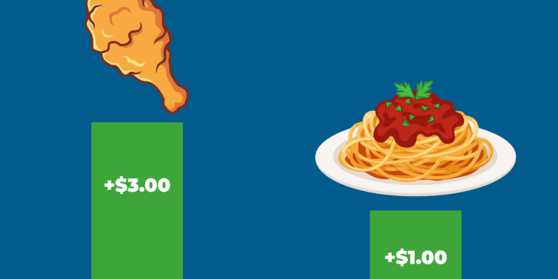 The consumer’s choice of a side of fruit, broccoli or french fries is then added to the cart, along with a drink. Additionally, with these pasta dishes, you can add your choice of protein and still keep the meal under $12.
