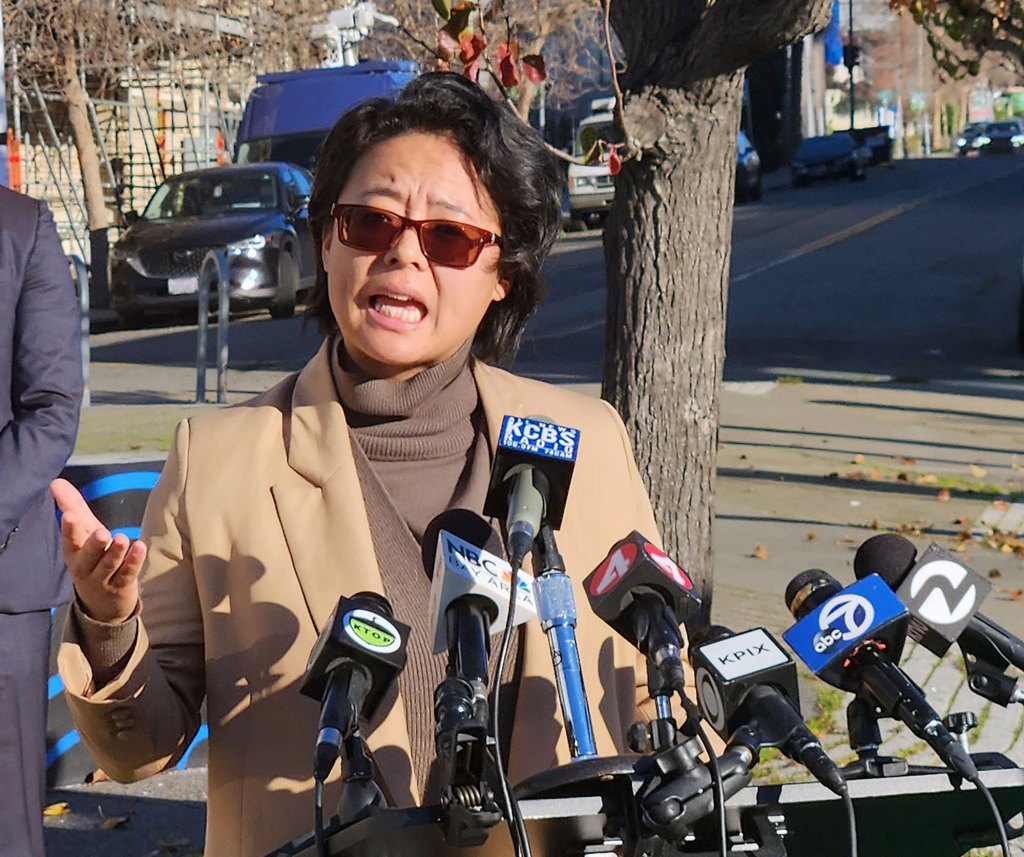 Oakland City Councilmember Charlene Wang addresses the media at a news conference in Oakland on Friday, Jan. 16, 2026. Wang, head of the city’s Public Safety Committee, welcomed the introduction of speed enforcement cameras said she’d like to see the program expanded. (Kiley Russell/Bay City News)