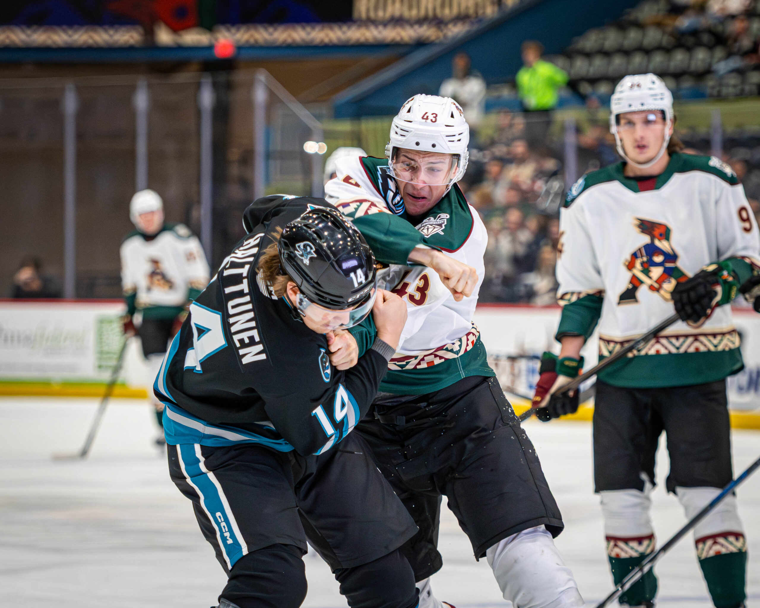 Tucson’s Julian Lutz drops the gloves with San Jose’s Kasper Halttunen. (Photo: Kate Dibildox / Tucson Roadrunners)
