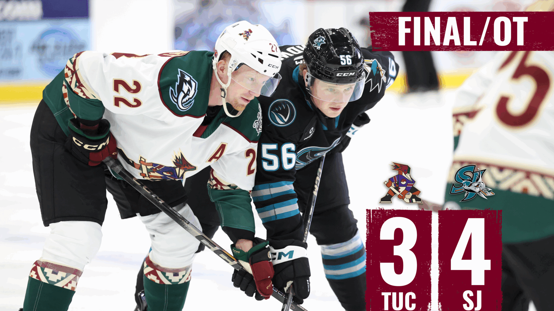 TUCSON, AZ – The Tucson Roadrunners (17-12-6-0) closed out their two-game series with a 4–3 overtime loss to the San Jose Barracuda (21-12-1-2) on U of A Night on Saturday at Tucson Arena.
