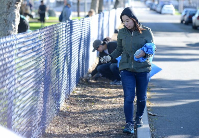Volunteers pick up trash at 14th Street Park at the MLK Day of Service.