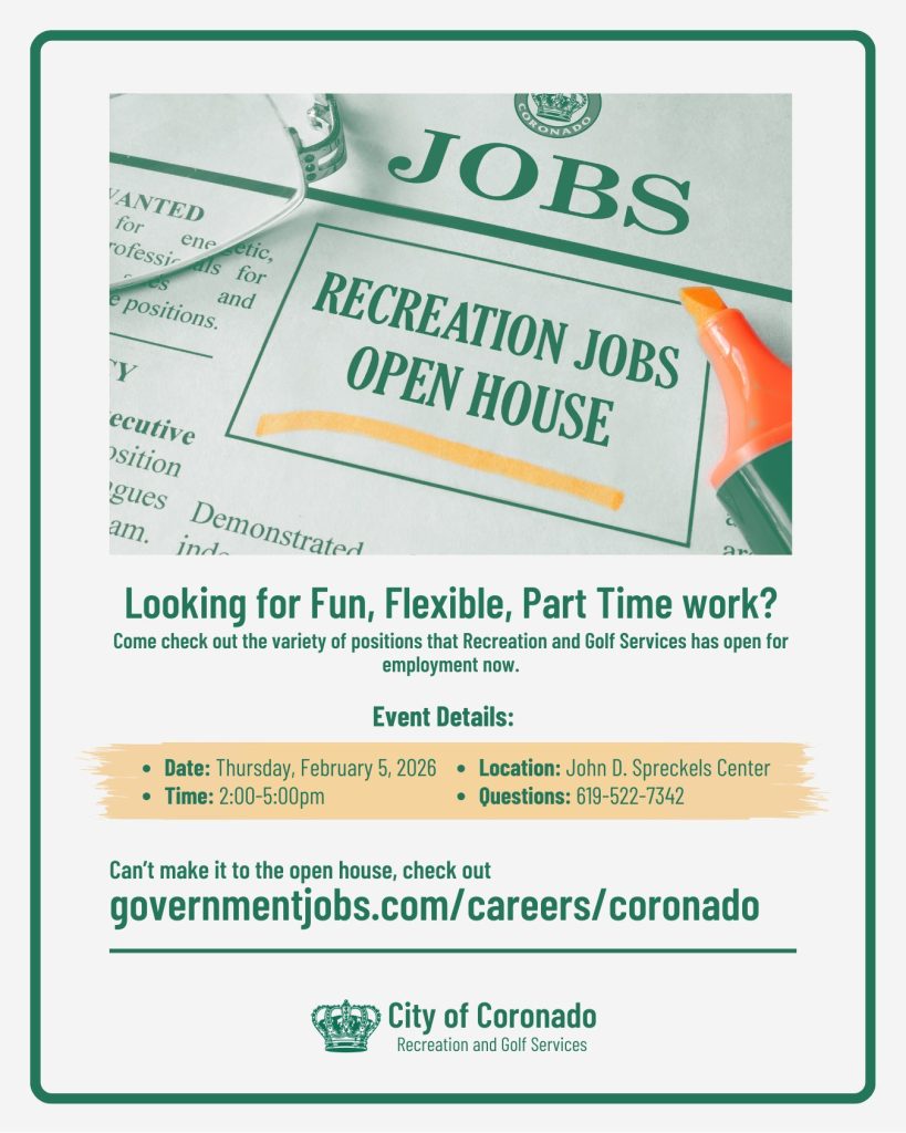 The Recreation Jobs Open House will be held on Thursday, February 5 from 2 to 5 pm at the John D. Spreckels Center, 1019 7th Street. Recreation and Golf Services is currently hiring for a variety of fun, flexible, part-time positions, including aquatics, day camps, and youth programs. Applicants can submit applications, learn about available roles, and interview on site. This event is an excellent opportunity to start a rewarding job while serving the Coronado community.