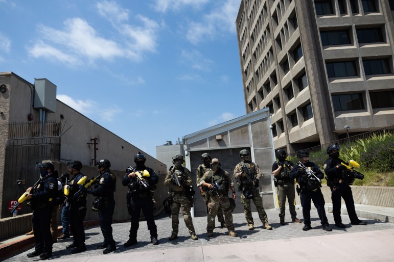 Federal Law enforcement guards an entrance where immigration enforcement drives in with vans to the ICE processing facility on Monday, June 9, 2025. Credit: JULIE LEOPO, Voice of OC