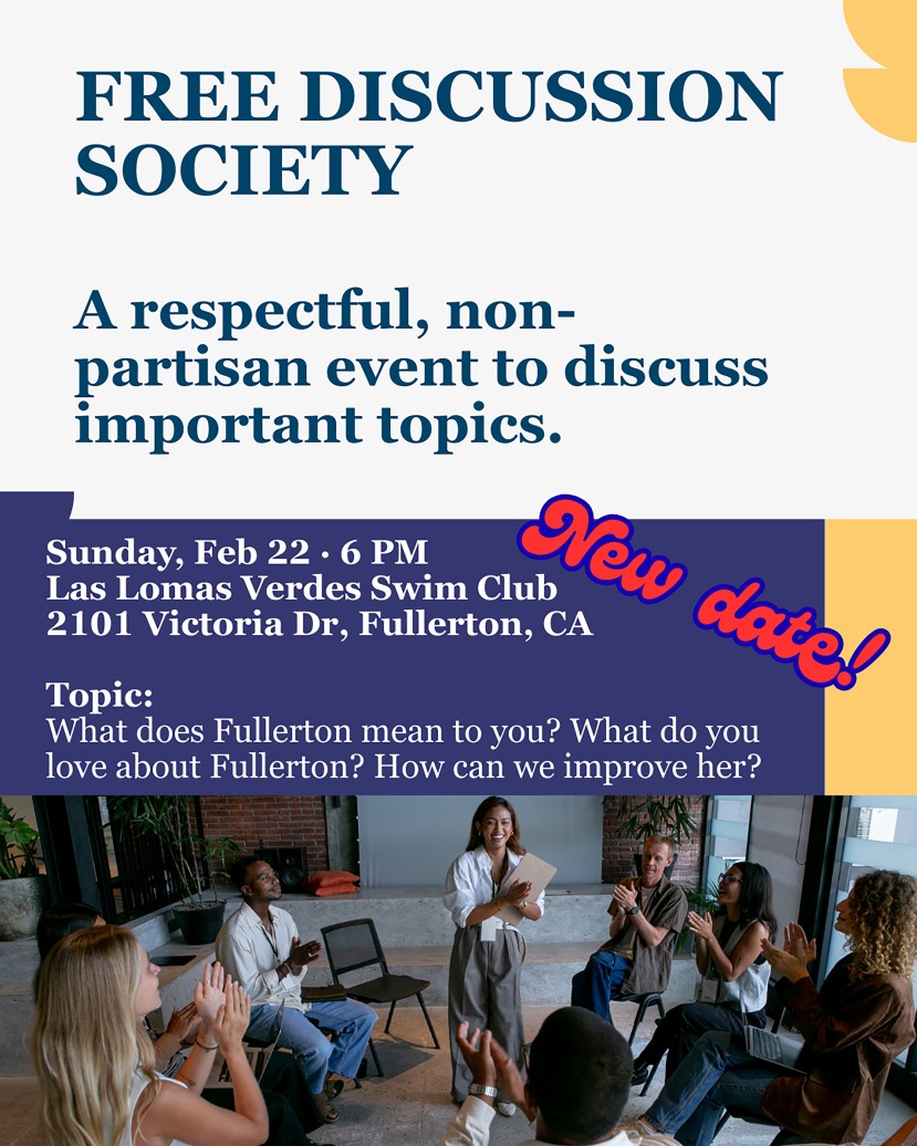 The Free Discussion Society is set to host an engaging community event inviting residents of Fullerton to share their thoughts and insights on the theme, “What does Fullerton mean to you?” Participants will have the opportunity to express what they love about the city and propose ideas for improvement.