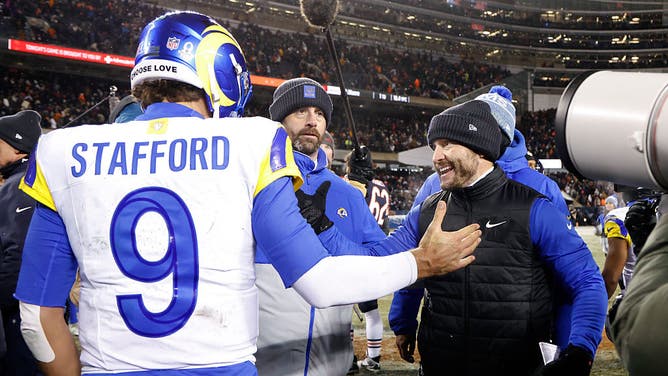 CHICAGO, ILLINOIS – JANUARY 18: (L-R) Matthew Stafford #9 embraces head coach Sean McVay of the Los Angeles Rams after the game against the Chicago Bears in the NFC Divisional Playoffs at Soldier Field on January 18, 2026 in Chicago, Illinois. Â (Photo by Michael Reaves/Getty Images)