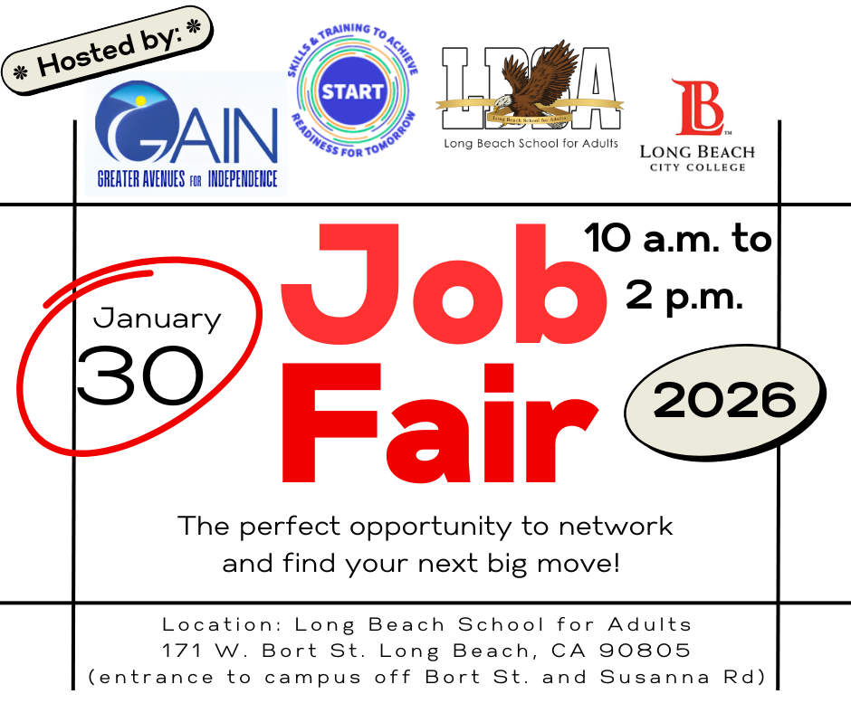 The Long Beach School for Adults will host a job fair on Friday, Jan. 30 from 10 a.m. to 2 p.m., open to the public and featuring more than 50 employers and training providers.