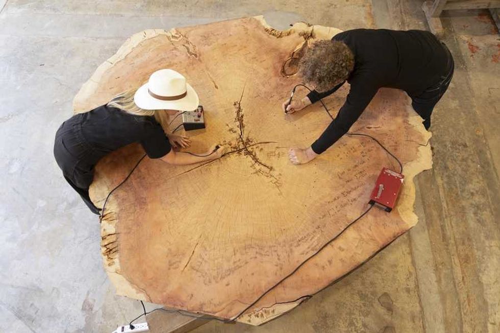 The largest of those lenses is the Tree of Knowledge, a 10,000-pound slice of salvaged eucalyptus on which etchings of humanity’s biggest questions spiral outward from those facing the earliest Homo sapiens to today’s technologically-induced concerns. The elephantine cross-section will dominate the Atrium at the Minnesota Street Project, while its lighter-weight twin appears side-by-side with other works examining the “history of history,” the way humans have archived knowledge for future generations (If We Lose Ourselves); key moments in California’s environmental and cultural history (Living on the Edge); the history of Jewish tradition (DendroJudaeology: A Timeline of the Jewish People); and more.