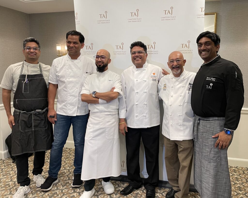 Indian Restaurant Week sheds Chefs Ashish Tiwari (ROOH), Srijith Gopinath (Copra), Pujan Sarkar (Tiya), Shibiraj Saha (Amber India), Ranjan Dey (New Delhi Restaurant), Thomas George (Bombay Brasserie) at Taj Campton Place on Sept. 24, 2025. Photo by Tamara Palmer