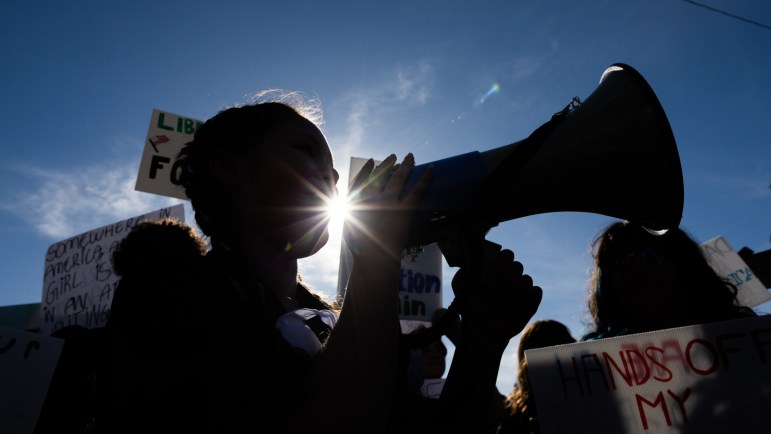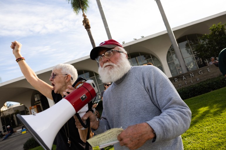 Students take turns chanting into a megaphone during the Free America walkout on Jan. 20, 2026, in Garden Grove, in protest of President Donald Trump’s presidency and in support of immigrant rights. Credit: JULIE LEOPO, Voice of OC