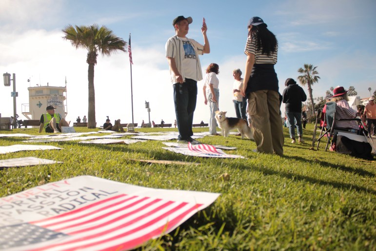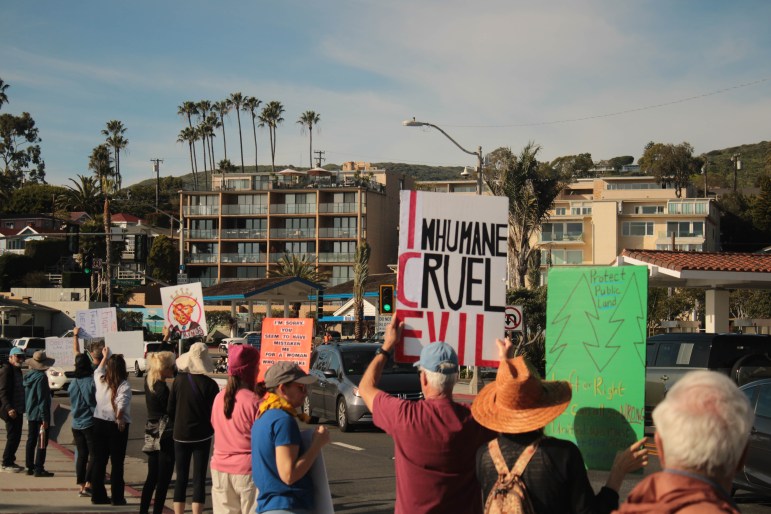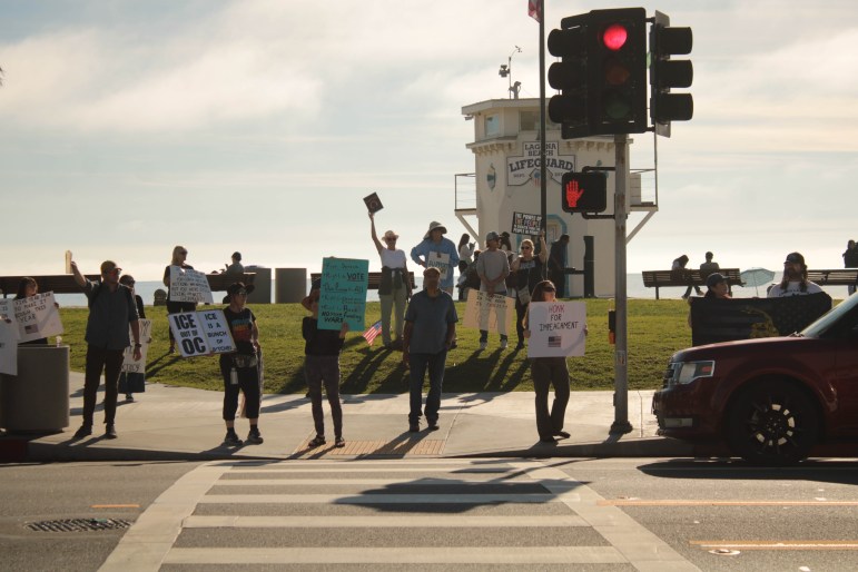 Protestors line up with signs on the side of the road in Laguna Beach on Tuesday, Jan. 20. 2026. Credit: MAXIMO SANTANA, Voice of OC