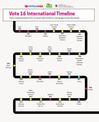 Vote 16 also has succeeded internationally. The Vote 16 USA timeline highlights how countries, states, and communities worldwide have adopted a 16-year-old voting age, from early Latin American and European adopters to recent U.S. expansions.