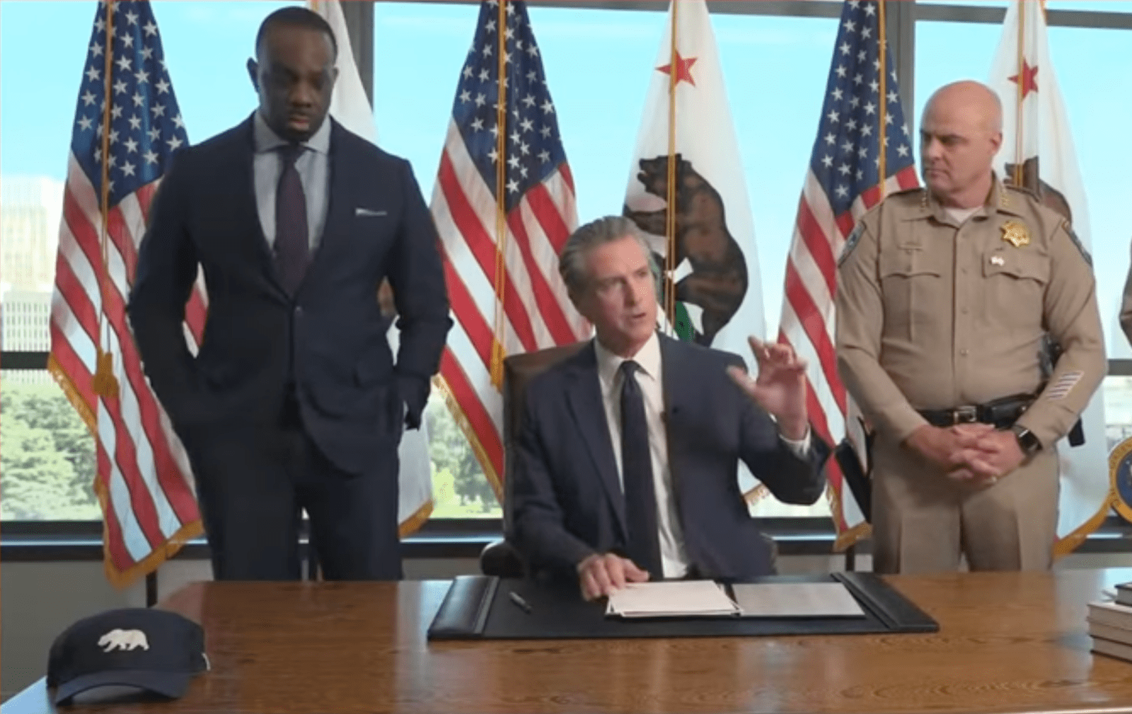 Gov. Gavin Newsom appears with CHP commissioner Sean Duryee, right, at a press conference at the state capitol, August 28, 2025, to announce the expansion of surges beyond Oakland. Credit: Governor’s office