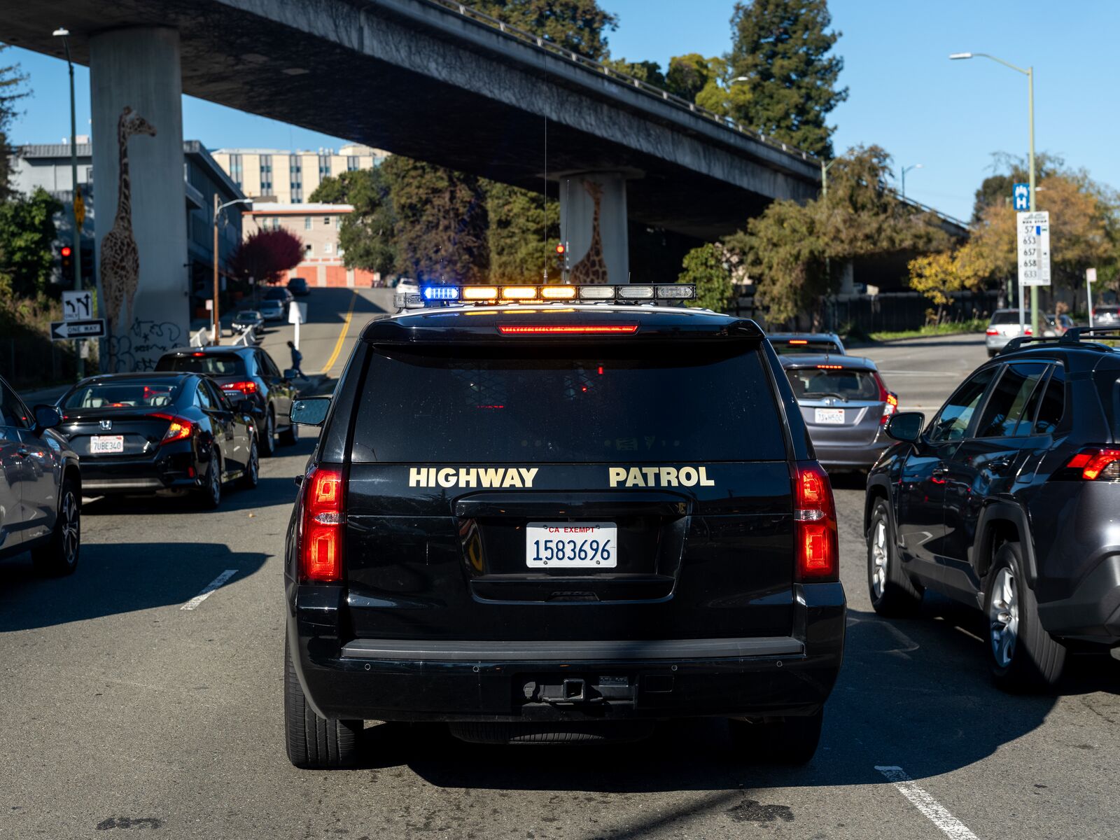A California Highway Patrol cruiser sits in traffic in Oakland on December 10, 2025. Credit: Jungho Kim for The Oaklandside