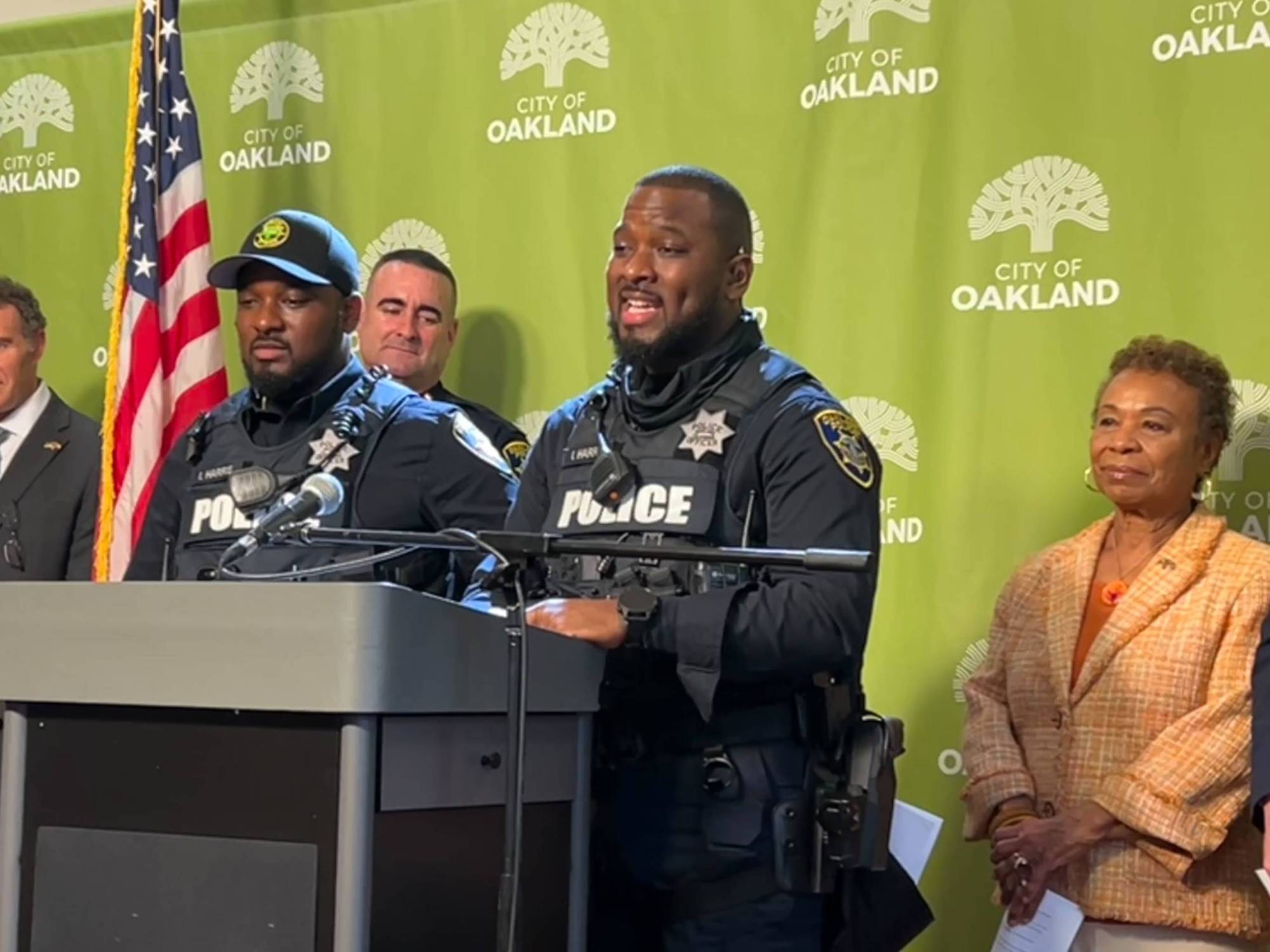 Twin brothers and Oakland police officers Isaac and Isaiah Harris stand alongside Mayor Barbara Lee and Interim Police Chief James Beere at a news conference on Jan. 21, 2026 to announce a nearly $1 million fund to restore OPD’s cadet program. (Daisy Nguyen/KQED)