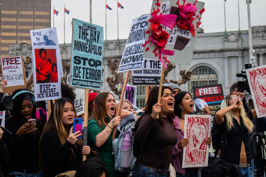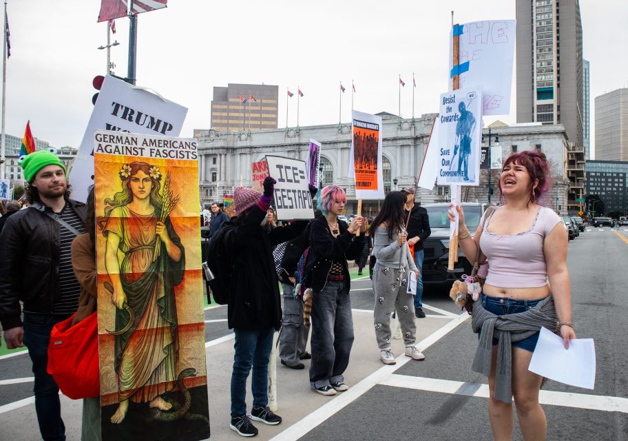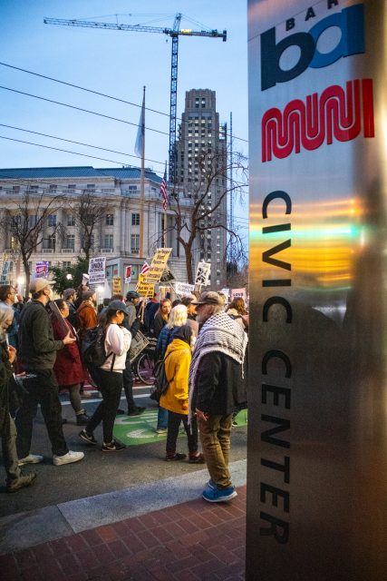Hundreds of San Franciscans gathered in front of City Hall on Tuesday afternoon both to protest President Donald Trump as he celebrated his first year back in office, and to declare plans to do so again over the next three years. The rally was organized by a coalition of progressive organizations after a call to action from the Women’s March.