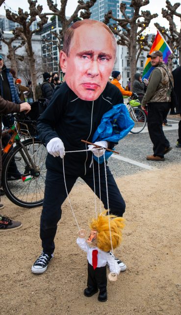 A woman who identified herself as the “Unorganized Artist” holds a Trump puppet while wearing a Vladimir Putin mask at Civic Center Plaza on Tuesday. Photo by Mariana Garcia.