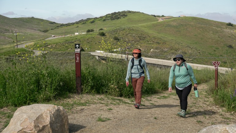 Mission Viejo resident Laurie Ha , 41, (right) and a friend finish hiking one of the newly opened trails at Saddleback Wilderness, part of OC Parks’ Irvine Ranch Open Space in Orange, Calif. on Satuday, April 8, 2023. (CREDIT:Jack Sundblad/VOICE OF OC)