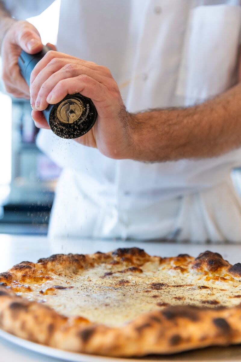 Top: Flour + Water’s pizza dough, made in a central kitchen in North Beach, uses flour from Petaluma’s Central Milling. The pizza shop menu includes a pesto pizza. Bottom: Chef de cuisine Elliott Armstrong tops off a cacio e pepe pizza with fresh pepper. Credit: Estefany Gonzalez for East Bay Nosh
